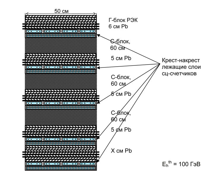 • новый тип центрального гибридного калориметра в сочетании с ренгеноэмульсионной камерой (РЭК), позволяющей изучать характеристики отдельных высокоэнергичных адронов в составе столов ШАЛ, и толчковой установкой, представленной двумя слоями протяженных узких сцинтилляционных счетчиков, расположенных крест-накрест и обеспечивающих возможность эффективного сопоставления двух типов событий: событий ШАЛ, регистрируемых в режиме реального времени, и событий РЭК, непрерывно накаливаемых в пассивном режиме в ходе всего периода экспозиции РЭК; чувствительными элементами самого адронного калориметра станут несколько парных слоев таких же протяженных (4-метровых) пластиковых сцинтилляционных счетчиков с оптоволоконным съемом сигнала.