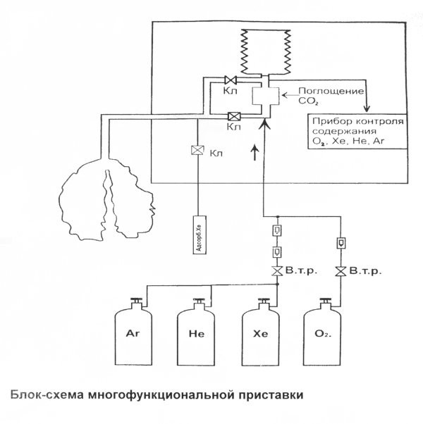 В аппарате установлены Аппарат работает по закрытому контуру, что позволяет существенно уменьшить расходы Xe, Ar, He. Полученные результаты. На данном аппарате впервые доказано, что для получения хорошего терапевтического воздействия на организм пациента, в частности ксенона, не нужна наркозная концентрация благородного газа, вдыхание кислородных смесей проходит при ясном сознании пациента, через маску или загубник по закрытому контуру. Достигнута стойкая ремиссия у больного с возрастной атрофией коры головного мозга и при паркинсонизме. Проведено с хорошими результатами лечение больного с постгипоксической энцефалопатией. У больных нормализовался липидемический профиль крови, нормализовалось повышенное артериальное давление, улучшилась микроциркуляция и оксигенация тканей, ускорились в 3 раза регенеративные процессы. Результаты, полученные при использовании многофункциональной наркозной приставки в Больнице РАН в г. Троицке, внедрены в клинику высоких технологий ИПЛИСОР.